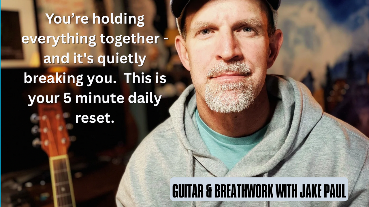 Using a simple 5-10-minute breath + guitar practice, we retrain your nervous system out of survival mode so you can stop checking out and start actually being in the room with the people you love.